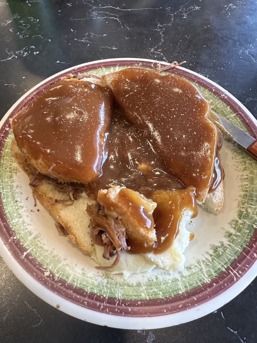 The hamburger soup was just okay, nothing to write home about. However, the roast beef between bread with potatoes all smothered in gravy was absolutely perfect! Exactly what I was needing without realizing it. The waitress was not friendly initially and took forever to take just our drink orders. I think she was overly busy and had a bit too much on her workload but she softened up as our meal finished up. I love these hole in the wall diners, they're always the ones that surprise me the most. Let me tell you, the price for lunch, 2 people, was just a little over $25. You can't find those prices in fast food these days! This is a, not so hidden, gem (right off the main drag) that most everyone can find something comforting to eat with a hometown, diner, old school kind of vibe. Don't just drive on by, stop and see for yourself!
